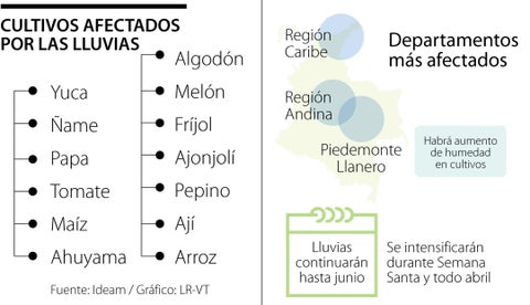 Entre los cultivos que podrían verse más afectados, según investigadores de Agrosavia, están: yuca, ñame, papa, arroz, algodón, maíz, frijol, ajonjolí y algunos cultivos hortícolas como pepino, ahuyama, tomate, ají pimentón, ají topito, lechuga, cilantro, cebolla cabezona y en rama (por sus condiciones químicas). Así mismo, el plátano y el banano podrían afectarse por el exceso de humedad debido a las lluvias.